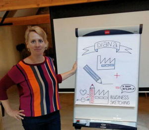Diana Janssen, Business Sketching, is de workshopleider van deze avond. Business Sketching helpt bedrijven en instellingen om sneller tot de essentie te komen in overleggen en documenten door deze samen te visualiseren. Business Sketching zorgt ervoor dat de essentie van dikke beleidsnotities, oeverloze vergaderingen en saaie presentaties wel aankomt bij je doelgroep. Dat doet zij door hier ofwel zelf beelden bij te maken of zij doet het samen d.m.v. een workshop visueel samenwerken.